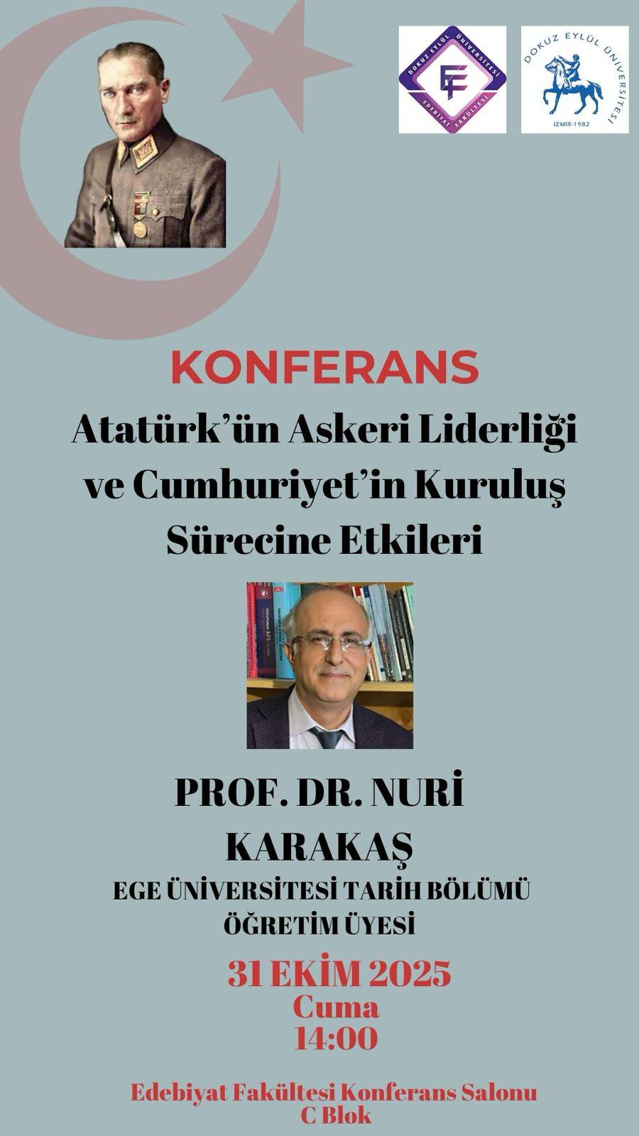 31 Ekim 2025, Konferans, “Atatürk’ün Askeri Liderliği ve Cumhuriyet’in Kuruluş Sürecine Etkileri ” Prof. Dr. Nuri KARAKAŞ, Atatürk’ün askeri liderliği üzerine bir konuşma gerçekleştirmiştir.
